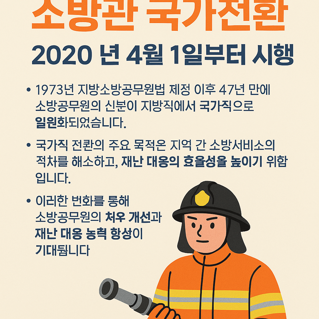먼저 결론부터 말씀드리면, 소방공무원의 국가직 전환은 2020년 4월 1일부터 시행되었습니다.